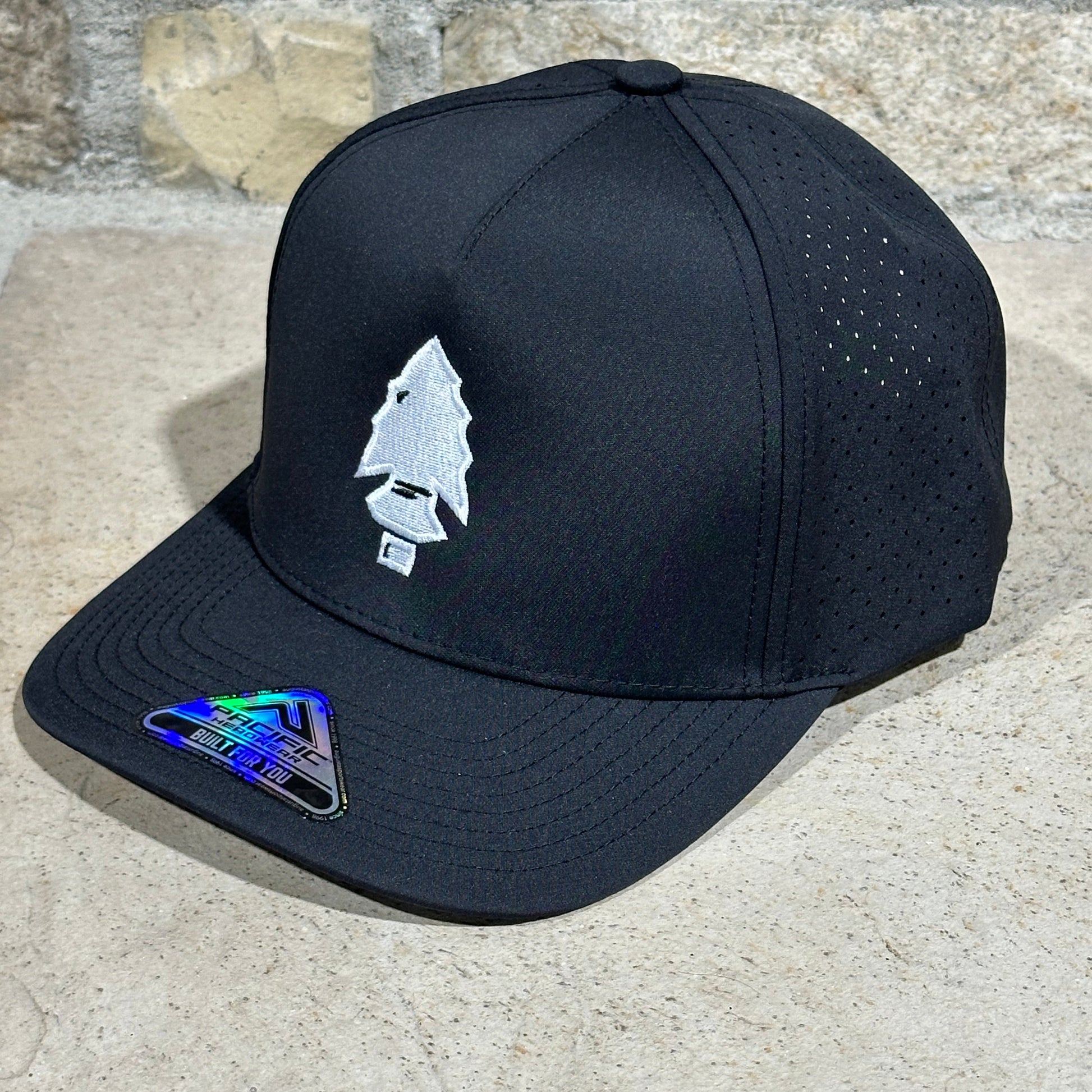 4. Black w/ White Embroidered Arrowhead Patch. Pacific Headwear Performance.